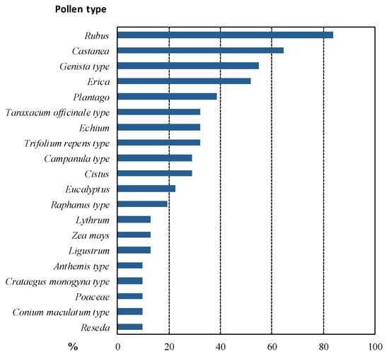 Considering the distribution of the different pollen types in samples, pollen grains from Rubus, Castanea, Genista type and Erica were present in more than 50% of the samples (Figure 2). Other frequent pollen types were from Taraxacum officinale type, Echium and Trifolium repens type (found in 30% of the samples). With regards the abundance of pollen types in each sample, some of the well-distributed pollen types such as Rubus, Castanea, Genista type, Taraxacum officinale type and Lythrum were found, at least in one sample, as dominant pollen (>45%) (Table 1). However, Rubus and Castanea were the most representative pollen types (26 and 20 samples, respectively), and those with the highest percentage counted in the pollen spectrum, with mean values above 22% and maximum value of more than 90% (Table 1).