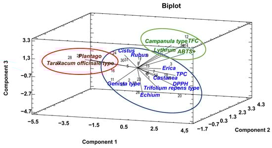The projection of the relationships among the palynological and chemical variables on the three first components is shown in Figure 3. The graphic representation shows the close relationship of the pollen variables Erica, Castanea, Trifolium repens type and Echium with TPC and DPPH, whereas Campanula type and Lythrum are closely related to ABTS and TFC. On the contrary, Genista type, Plantago and Taraxacum officinale type had an inverse relationship. Therefore, the bee pollen samples with higher presence of Erica, Castanea, Echium and Trifolium repens type had higher TPC and antioxidant activity. Bee pollen with high presence of Campanula pollen type and Lythrum were characterized by higher concentration of TFC and antioxidant content.