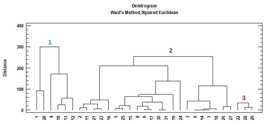 Dendrogram of cluster analysis with the distribution of bee pollen samples (1: group 1; 2: group 2; 3: group 3).