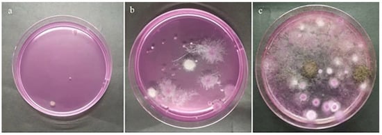 Plates used for microbial counts of different mildew grades of sunflower seed kernels: (a) normal, (b) slightly moldy, and (c) seriously moldy.