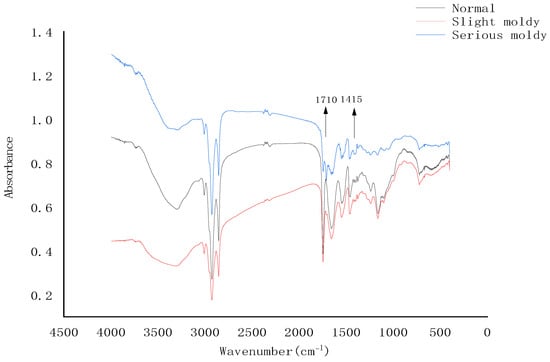 Samples with different mildew grades were evaluated by comparing their MIR spectra, as shown in Figure 3. Prominent differences in intensity were observed for the peaks at about 1710 cm−1 and 1415 cm−1, which were closely related to the mildew grade. Seriously moldy and slightly moldy samples both had a sharp peak at 1710 cm−1, and the peak intensity of seriously moldy samples was significantly higher than that of the slightly moldy samples, while normal samples had no peak at 1710 cm−1. The normal and slightly moldy samples both had a peak at 1415 cm−1, while the seriously moldy samples had no such peak. Bands at 1710 cm−1 and 1415 cm−1 corresponded to the C=O bending and C-N bending of fat and protein, respectively, for sunflower seed kernels contain about 50% fat and 30% protein. We conclude that fat produces a large number of small molecular ketones and aldehydes under the action of mold lipase and lipoxygenase, while protein produces peptides and amino acids under the action of mold protease. As a result, C=O bending appeared and C-N bending disappeared after mildew infection.