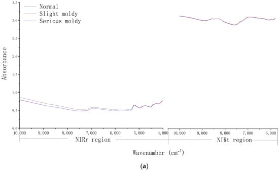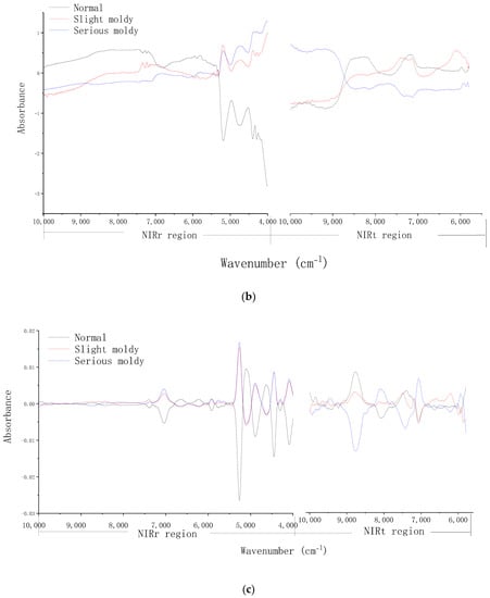 For the NIRr-NIRt (FD) spectrum (Figure 4c), the gap at the splicing site between the NIRr and NIRt spectra could be effectively reduced, with the absorbance oscillating around zero. Additionally, a significant difference among the different mildew grades was found between regions with strong characteristic absorption, which showed obvious peaks and valleys, while the absorbance values in other regions were approximately zero. As shown in Figure 4c, in the range spanning 3996–7000 cm−1 (1428–2502 nm) of the NIRr region, especially in its exclusive region 3996–5793 cm−1 (1762–2502 nm), several strong absorption peaks, including a peak corresponding to C=O bending (second overtone) in the region of 5263 cm−1 (1900 nm), and a peak corresponding to C-N bending (second overtone) in the region of 5208 cm−1 (1920 nm), were observed. This region exhibited absorption bands corresponding to fat and protein. Meanwhile, only flat curves in the NIRt region of 5793–7000 cm−1 (1428–1762 nm) were observed. Multiple absorption peaks in the region 7000–10,000 cm−1 (1000–1428 nm) of the NIRt region were observed, which also corresponded to fat and protein. Furthermore, peaks corresponding to C-H stretching (second overtone) in the region of 8200–8300 cm−1 (1204–1219 nm) and N-H stretching (second overtone) in the region of 9850–10,000 cm−1 (1000–1015 nm) were observed, while the spectral curve of NIRr in the region of 7000–10,000 cm−1 (1000–1428 nm) was relatively flat [29]. This shows that the spectral quality of NIRr is better than NIRt over the long wavelength range, and vice versa during the short wavelength range, which can be observed in Figure 4a,b.