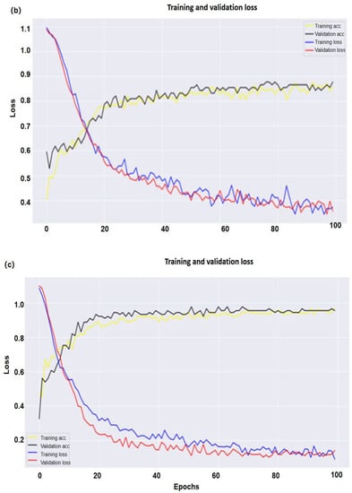 Discrimination accuracy and loss function across epochs of 1D-CNN model: (a) NIRr, (b) NIRt, and (c) NIRr-NIRt. Abbreviations: 1D-CNN, one-dimension convolutional neural network; NIRr, near-infrared diffuse reflectance; NIRt, near-infrared diffuse transmission.