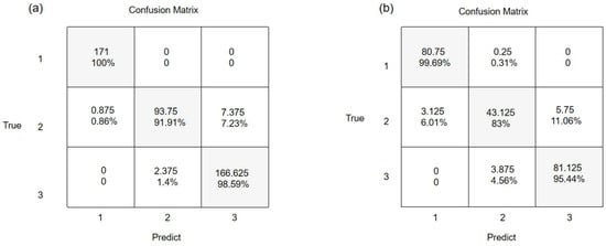 Confusion matrix of NIRr-NIRt fusion spectral 1D-CNN model: (a) training set and (b) test set (1, normal; 2, slightly moldy; and 3, seriously moldy). The value given in the confusion matrix represents the average of eight times for the training or test sets. Percentages were calculated as the ratio of samples predicted to be true to real samples at specific mildew grade. Abbreviations: 1D-CNN, one-dimension convolutional neural network; NIRr, near-infrared diffuse reflectance; NIRt, near-infrared diffuse transmission.