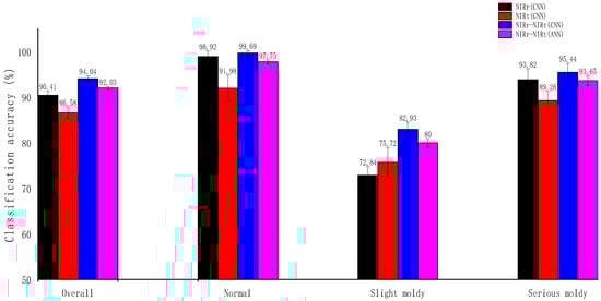 To evaluate the classification accuracy at the specific mildew grade, the fusion spectral 1D-CNN model was compared with the single spectral 1D-CNN and fusion spectral ANN model, which had the highest overall classification accuracy among the machine learning methods evaluated (Figure 8). As shown in Figure 8, for 1D-CNN, the fusion spectra exhibited the best classification performance at all mildew grades. For the discrimination accuracy of normal and seriously moldy samples, NIRr was better than NIRt. However, in terms of the discrimination accuracy of the slightly moldy samples, NIRt was better than NIRr. After spectral fusion, the discrimination accuracy at specific mildew grade all increased, with the slightly moldy samples increasing the most significantly. For the fusion spectral ANN model, the prediction accuracy rate of the normal, slightly moldy, and seriously moldy samples decreased by 1.94%, 2.93%, and 1.79% compared to fusion spectral CNN model, respectively, demonstrating the superiority of CNN over traditional machine learning algorithms.