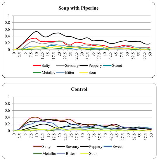 Figure 1 and Table 4 show TCATA attributes salty, savoury, peppery, sweet, metallic, bitter, and sour selected by participants during the evaluation of both soups. As expected, the soup with piperine had the peppery attribute selected more frequently than the control soup. The soup with piperine also demonstrated reduced sweetness in comparison to the control soup and was higher in bitter and sour attributes. The average proportion of participants’ citations for the saltiness of the control soup was higher than when the participants evaluated the soup with piperine. This result disagreed with the results of the general labelled magnitude scale (Table 3), which identified that the saltiness was significantly higher in the soup with piperine. Previous studies have also shown that oral chemical irritants added to both solutions and soup suppressed sweetness significantly and mildly suppressed saltiness, which aligns with the results of the TCATA [29,52]. Overall, the TCATA demonstrates that the intensity of salty, savoury, and sweet attributes was reduced with the addition of piperine to the low-sodium soup, while the intensity of peppery, bitter, and sour attributes was increased. This result also indicates that the use of dynamic sensory methodologies can identify differences in sensory perception that may be missed if only static scales are used.