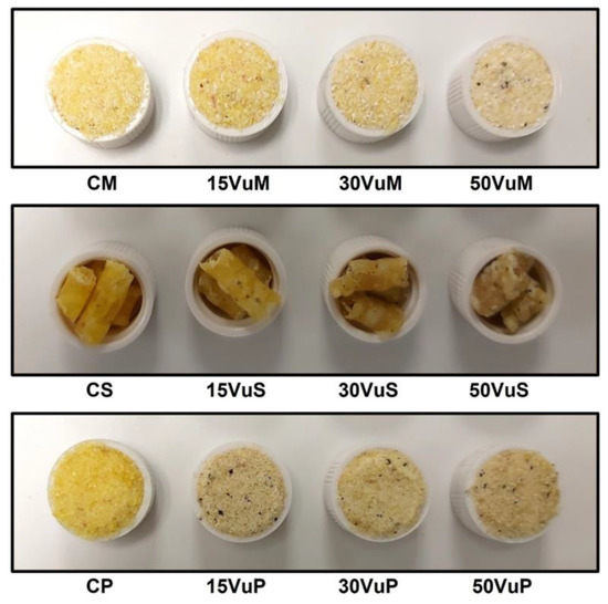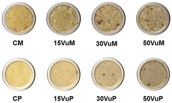 Considering the results of the physical properties measured in this work and the current trends in the use of vegetable protein, the samples hydrated for 18 h were the object of study. In this way, the color coordinates and appearance of samples hydrated for 18 h are shown in Table 2 and Figure 7, respectively. For each %Vu, there were significant (p < 0.05) differences in the color coordinates between M and P, showing higher values M. At the four concentrations of Vu studied, the ΔE1 was greater than three and therefore perceptible to the human eye [33]. Within the M samples, 50VuM showed significant differences (p < 0.05) in L*, a*, and b*, more marked than the rest. In the P samples, while L* and b* decreased with increasing Vu %, a* was stable. ΔE2 for both M and P presented significant (p < 0.05) differences due to the % Vu. The appearance of P samples (Figure 7) was homogeneous and compact. These samples can be used as a vegetable matrix to substitute proteins of animal origin. However, the M samples present an appearance of loose particles and a non-homogeneous matrix. This appearance change is due to processing (extrusion + drying), since there is no effect of Vu %.