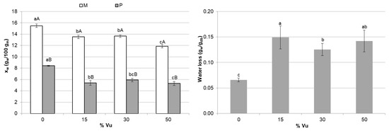 Mean values and standard deviation of moisture (xw) of the mixtures (M) and powder (P), and the total water loss (WL) of the process. For each parameter, the same small letter indicates homogeneous groups established by ANOVA (p < 0.05) by comparing the Vu percentages (0, 15, 30, and 50). For each Vu percentage (0, 15, 30, and 50) and parameter, the same capital letter indicates homogeneous groups established by ANOVA (p < 0.05) by comparing M and P.