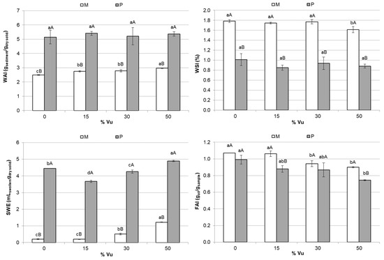 Mean values and standard deviation of the water absorption index (WAI), water solubility index (WSI), swelling index (SWE), and fat absorption index (FAI) of the mixtures (M) and powder (P). For each parameter, the same small letter indicates homogeneous groups established by ANOVA (p < 0.05) by comparing the Vu percentages (0, 15, 30, and 50) in M or P. For each Vu percentage (0, 15, 30, and 50) and parameter, the same capital letter indicates homogeneous groups established by ANOVA (p < 0.05) comparing M and P.