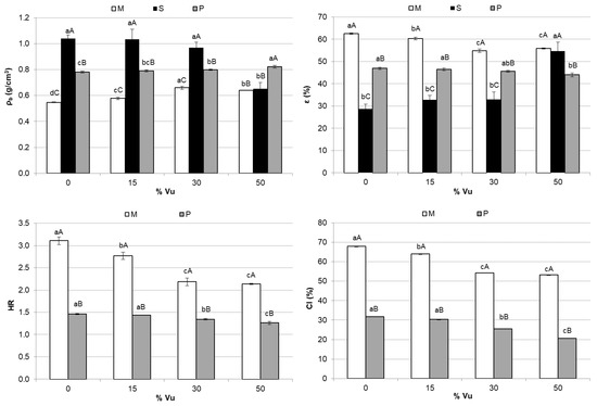 For each parameter, the same small letter indicates homogeneous groups established by ANOVA (p < 0.05) by comparing the Vu percentages (0, 15, 30, and 50) in M or P. For each Vu percentage (0, 15, 30, and 50) and parameter, the same capital letter indicates homogeneous groups established by ANOVA (p < 0.05) by comparing M and P.