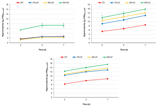 Figure 5 shows the evolution of the hygroscopicity of samples along 7 d. Hygroscopicity can be defined as the capacity of a powder to absorb water from the environment. This property can determine the stability of products during storage. Samples with lower hygroscopicity are desirable for handling and packaging [50]. After extrusion + drying, S and P showed significantly higher Hy values than M. Comparing S and P, S was less hygroscopic than P, so after the studied process (extrusion + drying), it was convenient to store in sections (pellet format) since S presented less hygroscopicity than P. Once its use is required, it can be crushed, and a powder will be obtained. In addition, S is denser than P, as indicated above, and therefore, the same mass occupies less volume in storage. In S and P, there was a significant (p < 0.05) and increasing effect with an increasing concentration of Vu. However, only 50VuM showed significant differences in Hy in the M samples.