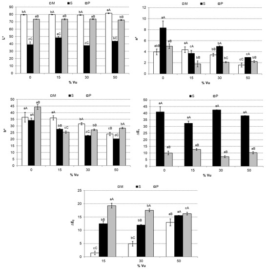Mean values and standard deviation of color coordinates (L*, a*, and b*) and the total color differences (ΔE1 and ΔE2) of the mixtures (M), the section of the pellet (S), and powder (P). For each parameter, the same small letter indicates homogeneous groups established by ANOVA (p < 0.05) by comparing the Vu percentages (0, 15, 30, and 50) in M, S, or P. For each Vu percentage (0, 15, 30, and 50) and parameter, the same capital letter indicates homogeneous groups established by ANOVA (p < 0.05) by comparing M, S, and P.