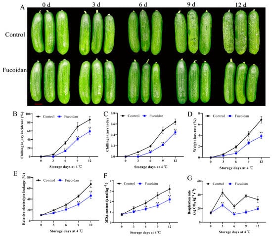 Photograph comparing (A), chilling injury incidence (B), chilling injury index (C), weight loss rate (D), relative electrolyte leakage (E), MDA content (F), and respiration rate (G) in cucumber fruit treated with 15 g L−1 fucoidan during storage at 4 °C. Cucumber fruit treated with distilled water was kept as the control. Values are marked as mean ± standard deviation (SD) of three replicates. The symbol of * and ** express significant differences at p < 0.05 and p < 0.01 between fucoidan-treated and control fruit, respectively.