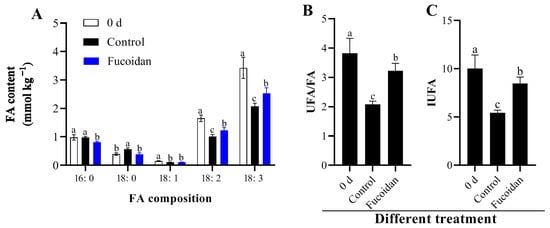 Contents of FA composition (A), UFA/FA ratio (B), and IUFA (C) in cucumber fruit at harvest (0 day) and in fucoidan-treated and control fruit after 12 d of storage at 4 °C. Values are marked as mean ± standard deviation (SD) of three replicates. Bars with same letter mean no significant differences at p < 0.05.
