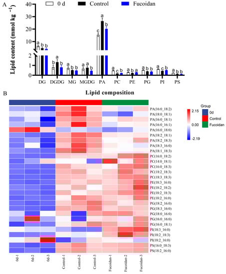 Four types of glycerolipids (diglycerides [DG], monoglycerides [MG], monogalactosyldiacylglycerol [MGDG], and digalactosyldiacylglycerol [DGDG]), and six types of phospholipids (PA, phosphatidylethanolamine [PE], PC, phosphatidylserine [PS], phosphatidylglycerol [PG], and phosphatidylinositol [PI]) were identified in cucumber fruit at harvest and 12 d postharvest at 4 °C (Figure 3A). Among them, the content of DGDG was higher at harvest, but it decreased on the 12th day of refrigeration with no difference between the fucoidan-treated group and the control group. The contents of MGDG and DGDG in the fucoidan-treated group were lower than those of control group, which may be one of the reasons for the difference in the final lipid content. Among the phospholipids, the PA content was much higher than that of the other phospholipid components. The PA content in fucoidan-treated fruit was much lower than those in control fruit on the 12th day of refrigeration. Other identified types of phospholipids except PG and PS increased in fucoidan-treated fruit (Figure 3A).