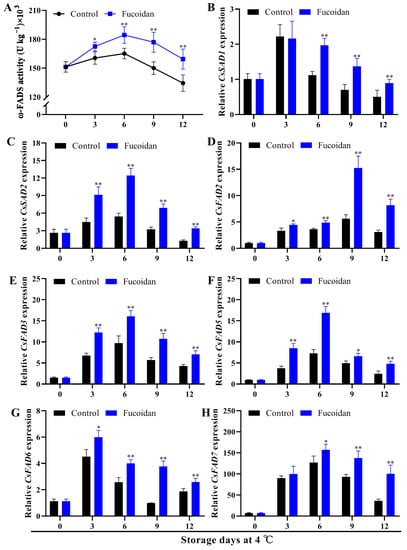 ω-FADS activity (A) and gene expression of CsSAD1 (B), CsSAD2 (C), CsFAD2 (D), CsFAD3 (E), CsFAD5 (F), CsFAD6 (G), and CsFAD7 (H) in fucoidan-treated and control cucumber fruit during storage at 4 °C. Values are marked as mean ± standard deviation (SD) of three replicates. Symbols * and ** express significant differences at p < 0.05 and p < 0.01 between fucoidan-treated and control fruit, respectively.