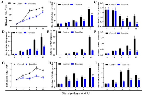 PLD activity (A) and gene expression of CsPLDα1 (B), CsPLDα2 (C), CsPLDβ (D), CsPLDγ (E), CsPLDζ1 (F), LOX activity (G), CsLOX1 (H), and CsLOX2 (I) in fucoidan-treated and control cucumber fruit during storage at 4 °C. Values are marked as mean ± standard deviation (SD) of three replicates. Symbols * and ** express significant differences at p < 0.05 and p < 0.01 between fucoidan-treated and control fruit, respectively.