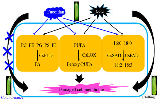The occurrence of CI in cucumber fruit during storage at 4 °C was effectively alleviated via fucoidan treatment. The alleviation of CI by fucoidan was involved in the regulation of membrane lipid metabolism. Fucoidan treatment enhanced the activity of ω-FADS, increased the index of UFAs, inhibited the activities of PLD and LOX, reduced the accumulation of PA and the degree of membrane lipid peroxidation, alleviated the damage to cell membrane caused by CI, maintained the cell membrane integrity, and improved the cold resistance of cucumber fruit (Figure 6). Therefore, we speculated that fucoidan treatment can be considered a new reference to optimize the low-temperature storage condition and minimize the detrimental effects induced by CI in cucumber fruits.