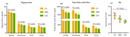 3) gelatin capsules (5.0 g per dose) were administered via the ruminal cannulas twice daily (0700 and 1900 h) from d 20 to 28. Duodenal, ileal, and rectal samples were taken every 3 h during the last 4 days (d 25–28) in a staggered schedule that allowed one sample for each 4 h of a 24 h period with a total of eight samples per site. Ruminal digesta were evacuated and measured on d 28 of each experimental period. The flow of digesta was intermittent, gushes varied between 100–500 mL, and was separated by intervals of less than 1 to more than 15 min. Approximately 250 g of spot digesta or feed samples were collected at each time point from each cow. At the end of each period, spot samples were pooled based on each cow within the period to provide a composite sample of digesta. Subsequently, the spot and pooled samples were stored at −20 °C until further chemical and marker analysis. Digesta flow entering the proximal duodenum and terminal ileum and fecal output were estimated as the means of two markers (PEG and Cr
