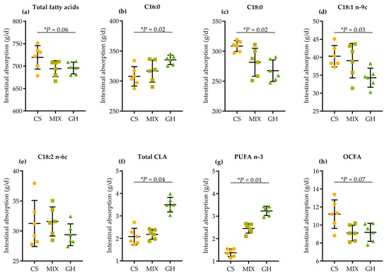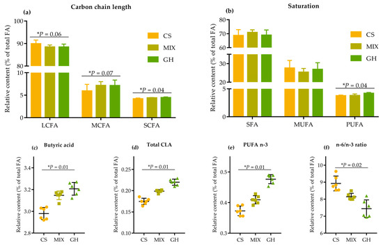 32] with different forage sources (DM basis): (1) 46% corn silage as the sole dietary forage source (CS), (2) a mixture of 23% corn silage and 14% grass hays (6% alfalfa hay and 8% oat hay) as the dietary forage source (MIX), and (3) 28% grass hays (12% alfalfa hay and 16% oat hay) as the sole forage source (GH). The diets were administered twice daily at 0700 and 1900 h in amounts that allowed 10% orts. The corn silage was harvested at a stubble height of 40 cm, theoretical chop length of 2.1 cm, and roll clearance of 1.5 mm. The chemical composition and FA profile of the varied ingredients are presented in