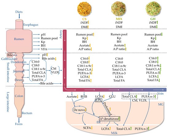 Therefore, the objectives of the present study were to investigate the effects of different dietary forage sources on 3 systems/organs: (1) the dietary iNDF content and FA composition, (2) VFA concentration in the rumen, FA biohydrogenation and digestion in the GIT, as well as (3) the arteriovenous difference and desaturase activity in the MGs. Our findings can be used to gain insight into the holistic landscape of lipid metabolism from the GIT to the MGs, and the overall mechanism of forages regulating HPFA status in milk of dairy cows.