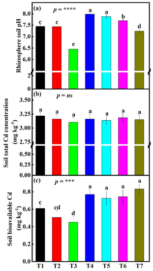 Influence of different fertilizer treatments on rhizosphere (a) rhizosphere soil pH, (b) soil total Cd concentrations, and (c) soil bioavailable Cd under small-scale plot experiment. Data (means ± SE, n = 5) followed by different subscripts denotes significant differences between treatments at p < 0.05 according to Tukey’s HSD. p-values of one-way ANOVA, are indicated: p < 0.001, ***; p < 0.0001, ****; ns, not significant. Treatments: sepiolite (Mg4Si6O15(OH)2•6(H2O)), 1.27 kg m−2 (T1); sodium metasilicate (Na2SiO3), 0.03 kg m−2 (T2); humic acid, 0.07 kg m−2 (T3); calcium magnesium phosphate fertilizer, 0.09 kg m−2 (T4); ferrous sulfate (FeSO4), 0.07 kg m−2 + manganese sulfate (MgSO4), 0.007 kg m−2 (T5); 6) straw biochar, 0.75 kg m−2 (T6); and the control treatment (no chemicals added) (T7).