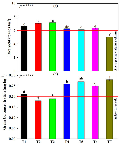 When measuring Cd accumulation in rice grains, a significant difference (p < 0.0001) was found amongst the different fertilizer treatments (Figure 3b). Cd accumulation in rice grains was highest under treatment T7 (0.28 mg kg−1). From highest to lowest, the use of different amendment treatments led to a 47.4, 35.7, 25, 10.7, 7.7, and 3.6% decline in Cd accumulation in rice grains, T3, T2, T1, T6, T4, and T5, respectively. An insignificant difference was noticed between treatments T2 and T5. However, it is also worth noting that only treatment T2 (0.18 mg kg−1) and T3 (0.19 mg kg−1) managed to produce grains with a Cd concentration lower than the safety threshold (0.2 mg kg−1) (Figure 3b).