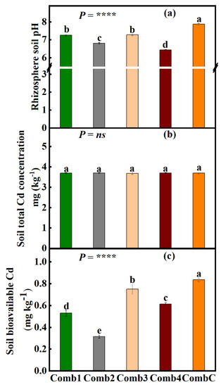 Although the differences in total Cd concentrations among different combinations were insignificant (Figure 4c), soil-bioavailable Cd was significantly influenced by the different amendment combinations (p < 0.0001) (Figure 4b). It was also found that soil under amendment combination Comb2 had the highest decline in bioavailable Cd concentrations (62.3%), followed by Comb1 (36.6%), then Comb4 (26.6%), and last Comb3 (10.3%) relative to CombC. All the amendment combination treatments were significantly different from each other.