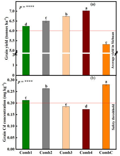 The Cd concentrations in rice grains were also checked, and found that Cd concentrations were significantly influenced by combination treatments (p < 0.0001) (Figure 5b). Rice grains under CombC treatment had the highest Cd concentration (0.28 mg kg−1), which was slightly higher than the safety threshold level in China (0.2 mg kg−1). Compared to CombC treatment, grain Cd concentration declined by 32.2, 30.4, 24.3, and 6.1% (Comb4, Comb3, Comb1, and Comb2, respectively). Although grain Cd concentrations under all combination treatments were significantly different from each other, only concentrations under Comb3 and Comb4 managed to go below the safety threshold.
