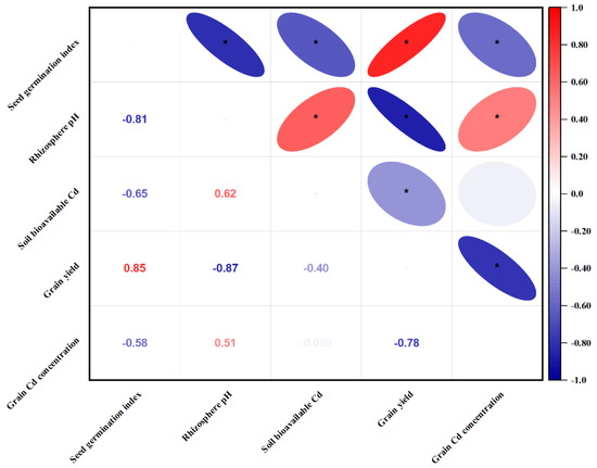 Correlation matrix showing relationships between seed germination index, rhizosphere pH, soil bioavailable Cd, grain yield, and grain Cd concentration under a large-scale field experiment. Red color denotes positive relationships; blue color denotes negative relationships. Left-inclined ellipses denote a positive relationship, right inclined ellipses denote a negative relationship. Asterisks represents significant correlations.