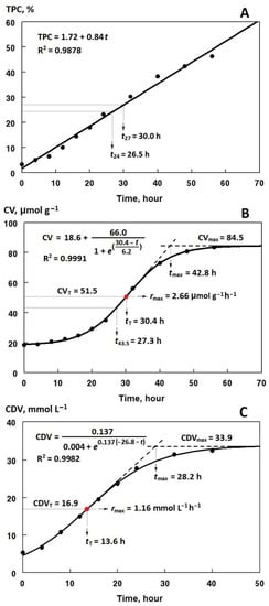 Kinetic curves of the accumulation of conjugated dienes were drawn by plotting the changes in CDV (mmol/L) versus time t (h). The sigmoidal Equation (5) was fitted on the kinetic data points [15]: