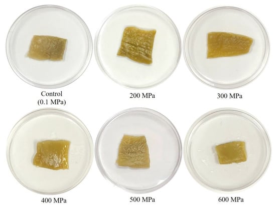 The changes of appearance and color values in mustard pickle samples after HHP are presented in Figure 1 and Table 2, respectively. Compared with mustard pickle samples in the control group, high-pressure treatment gave the mustard pickle samples a brighter appearance (Figure 1). Additionally, the L*, a*, b*, and W values of the control group were 39.34, 3.74, 30.62, and 33.04, respectively. After HHP treatment, the L* values of the samples increased with the increasing pressure, reaching a maximum of 46.29 after processing at 600 MPa. The a* values displayed a tendency to decrease slightly with increasing pressure, reaching a minimum of 2.09 after processing at 600 MPa, while the b* values tended to decrease slightly with increasing pressure, reaching a minimum of 21.88 after processing at 600 MPa. The W values exhibited the same trend as the L* value, namely, the W values increased with increasing pressure, reaching a maximum of 41.95 after processing at 600 MPa. The ΔE (color difference) increased from 6.83 after processing at 200 MPa to 45.72 at 600 MPa. The aforementioned findings and their comparison with the changes in appearance presented in Figure 1 revealed that the high-pressure processing made the mustard pickle look brighter and whiter.
