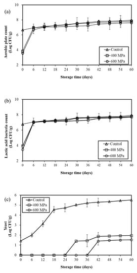 Changes of (a) aerobic plate count (APC), (b) lactic acid bacteria count, and (c) yeast in mustard pickles treated with HHP at 400 and 600 MPa for 5 min during storage at 25 °C.