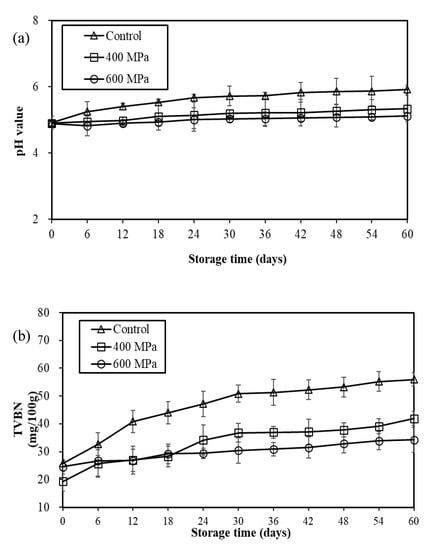 The variation of pH and TVBN values in mustard pickles stored at 25 °C induced by HHP treatment (400 and 600 MPa) is illustrated in Figure 3. The pH value of initial samples was about 4.9, and the pH values in the control group increased slowly with time, reaching about 5.92 at the 60 days of storage. However, the pH values of the 400 and 600 MPa high-pressure groups did not change obviously during storage and were significantly lower than those of the control group during the same storage time (Figure 3a). The findings indicated that the high-pressure treatment significantly inhibited the pH increase in mustard pickles during storage at 25 °C. The possible reason was that HHP treatment inhibited the growth of yeast (Figure 2c), especially some yeasts that produced biogenic amines that are rich in mustard pickle, thus delaying the rise of the pH in HHP samples [].