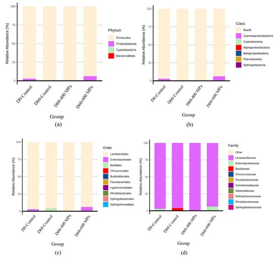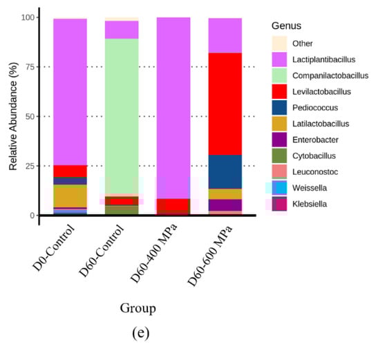 Figure 4 presents the results of species annotation of mustard pickle samples in the control 400 MPa and 600 MPa high-pressure groups after 60 days of storage at 25 °C. In terms of phylum level, the dominant bacteria in the D0-control, D60-control, 400 MPa (D60-400 MPa), and 600 MPa (D60-600 MPa) groups were Firmicutes, which accounted for 97%, 100%, 100%, and 94%, respectively (Figure 4a). In terms of class level, the dominant bacteria in the D0-control, D60-control, D60-400 MPa, and D60-600 MPa groups were Bacilli, with proportions of 97%, 100%, 100%, and 94%, respectively (Figure 4b). In terms of order level, the dominant bacteria in the D0-control, D60-control, D60-400 MPa, and D60-600 MPa groups were Lactobacillales, a proportions of 97%, 96%, 100%, and 94%, respectively (Figure 4c). In terms of family level, the dominant bacteria in the D0-control, D60-control, D60-400 MPa, and D60-600 MPa groups were Lactobacillaceae, with proportions of 97%, 96%, 100%, and 94%, respectively (Figure 4d). In terms of genus level, the dominant bacteria in the D0-control group were Lactiplantibacillus (74%), Latilactobacillus (12%), and Levilactobacillus (6%). The dominant bacteria were Companilactobacillus (80%) and Lactiplantibacillus (9%) in the D60-control group, Lactiplantibacillus (92%) and Levilactobacillus (8%) in the D60-400 MPa group. Moreover, Levilactobacillus (52%), Pediococcus (17%), and Lactiplantibacillus (17%) were the dominant bacteria in the D60-600 MPa group (Figure 4e).