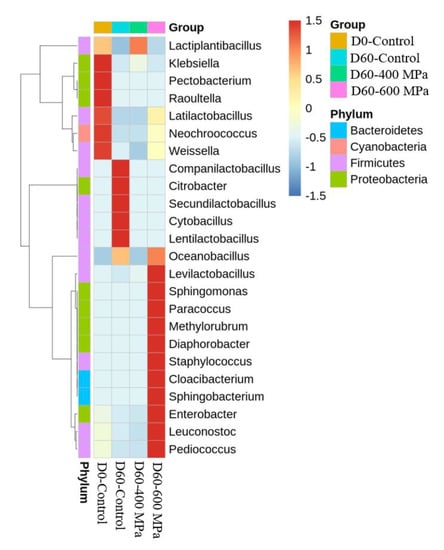 Heat map of microorganism species abundance on the genus level, as a result of the non-HHP group (D0-control), non-HHP group stored at 25 °C for 60 days (D60-control), and 400 MPa group (D60-400 MPa) and 600 MPa group (D60-600 MPa) stored at 25 °C for 60 days.