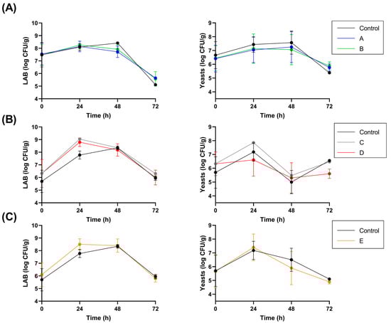 The LAB appeared to have their maximum growth at 24–48 h from the beginning of the fermentation, whereas the growth of yeasts appeared to decrease earlier compared to LAB, which may be due to the higher sensitivity of yeasts to the stress factors, such as the low pH and high temperature that start to take place after 48 h of fermentation.