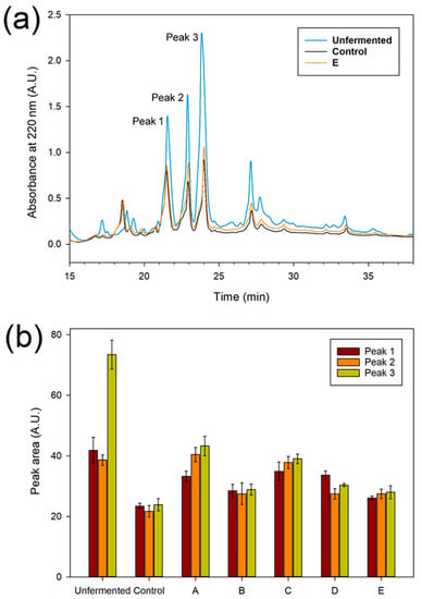 Peptide profile of unfermented and fermented samples. (a): RP-HPLC chromatograms of peptide extracted from cocoa beans. For the sake of comparison, only chromatograms from unfermented, control and co-culture at t0 + t48 have been reported. Chromatograms of all the samples are available in Figure S1. (b): Areas of the three main peaks observed in RP-HPLC chromatograms; unfermented: unfermented cocoa beans; control: spontaneous fermentation; A: inoculated with L. fabifermentans at t0; B: inoculated with L. fabifermentans at t0 and t48; C: inoculated with F. rossiae at t0; D: inoculated with F. rossiae at t0 and t48; E: inoculated with both strains at t0 and t48.