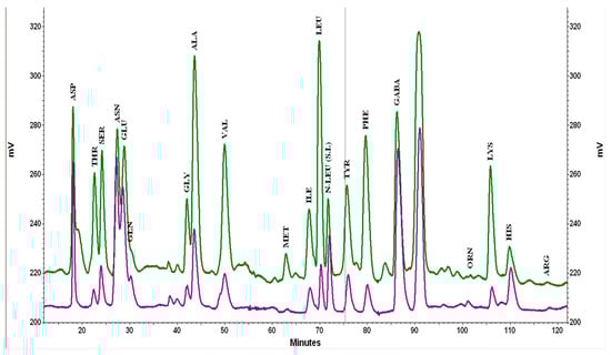 The chromatographic profiles of free amino acids in the unfermented cocoa and the spontaneously fermented control are shown in Figure 4. The obtained data, including those of A–E samples after six days of fermentation, are compiled in Table 2, expressed as mg/g of total protein. The total amount of free amino acids in the fermented samples was almost twice that of the unfermented sample. The inoculation of the strain F. rossiae SAF51 appears to promote the liberation of amino acids when compared to the samples inoculated with the strain L. fabifermentans SAF13. The fermentation protocol influenced the final concentration of single amino acids and the total amount of amino acids slightly decreased in samples inoculated at both t0 and at t48. The amount of some amino acids decreased during the fermentation (Asn, Gln, Gaba, His, Arg), some remained unchanged (Asp, Glu, Pro), and other increased significantly (Thr, Met, Leu Phe, Lys).