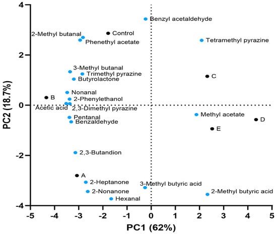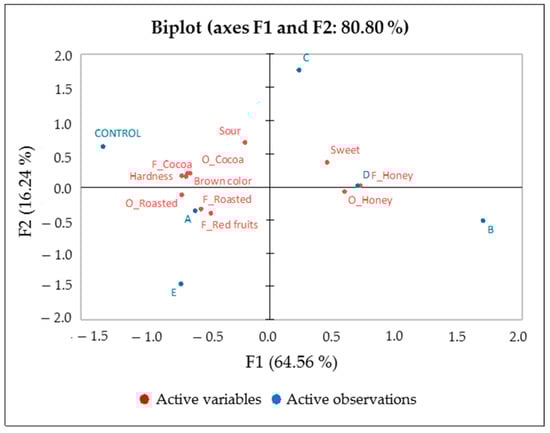Three-way ANOVA results indicated that the panel of assessors was reliable (Table S3) and that all the sensory descriptors significantly (p < 0.05) discriminated the samples. Since ANOVA results indicated that the mean scores for each sample given by the panel for each attribute could be assumed satisfactory estimates of the sensory profile of samples (Table S3), sensory data were averaged across assessors and replicates and submitted to PCA. According to correlation loadings plot, variables with less than 50% explained variance were left out from the analysis (i.e., red fruits odour, astringency, and bitter). The biplot based on samples and the remaining variables is shown in Figure 6. The variance explained by the first two principal components was 80.80%. Moving from left to right along the first component (explained variance 64.56%) of Figure 6, the control sample and samples A and E were separated from the rest of the samples. The second component (explained variance 16.24%) distinguished samples C from E. The control sample (positioned in the upper left pane, Figure 6) was mainly described by brown colour, cocoa odour and flavour, sourness, and hardness and only partially by roasted odour and flavour. Samples A and E were mainly perceived with high intensity of roasted odour and flavour, as well as red fruits flavour. These samples (A, E, control) had also the lowest intensity of sensory properties (honey odour and flavour and sweetness) located in the positive part of PC1 of Figure 6, which mainly characterise samples D and B. Sample C (located in the upper right pane, Figure 6) was mainly sour.