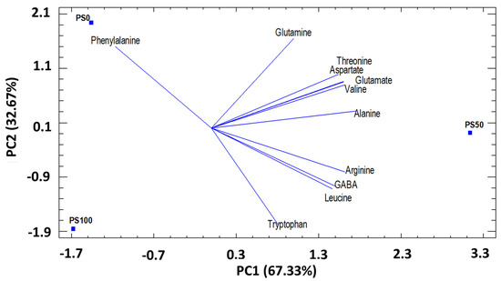 To achieve a better understanding of the trends and relationships between the amino acids studied (11) in pomegranate leaves (in three substrates), principal component analysis (PCA) was applied. The first two principal components (PC) explained 100% of the total variation. The first component (PC1), which represents 67.33% of the total variance, was related to the amino acids’ GABA, alanine, valine, arginine, leucine, threonine, aspartate, and glutamate. PC2 represented 32.67% of the total variance. It was correlated with the content of tryptophan, phenylalanine, glutamate (Figure 1). The PCA results showed that the PC1 axis allows to clearly discriminate the PS0 and PS100 substrates from the PS50 substrate (Figure 1). PC2 allows discrimination of PS0, PS50 and PS100 substrates, especially PSO of PS100.