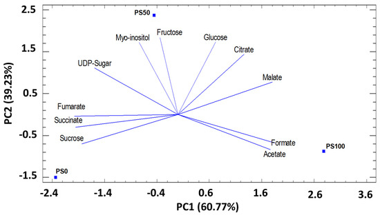 Regarding PCA for sugars and organic acids studied (11) in pomegranate leaves (in three substrates), the first two principal components (PC) explained 100% of the total variation. The first component (PC1), which represents 60.77% of the total variance, was related to the organic acids formate, acetate, malate, fumarate, succinate and with the sugar’s sucrose, fructose, glucose, and UDP-sugar. PC2 represented 39.23% of the total variance. It was correlated with the content of citrate, fructose, glucose, myo-inositol (Figure 2). The PCA results showed that the PC1 axis allows to discriminate the PS0 and PS50 substrates from the PS100 substrate, and especially PS0 from PS100. PC2 allows discrimination of PS50 substrates from PS0 and PS100 (Figure 2).