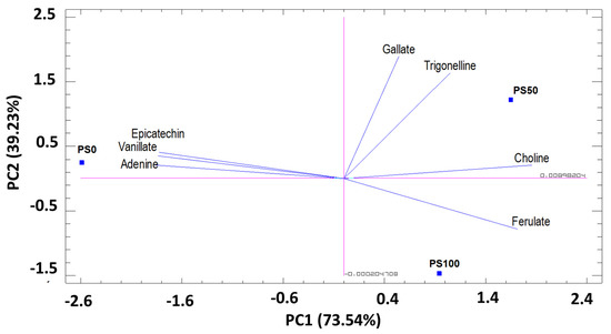 The PCA of secondary metabolites and others (7 metabolites) in pomegranate leaves (on three substrates), confirmed that the first two principal components (PC) explained 100% of the total variation. The first component (PC1), which represents 73.54% of the total variance, was related to choline, adenine, ferulate, epicatechin, and vanillate. PC2 represented 26.46% of the total variance. It was correlated with the content of trigonelline and gallate (Figure 3). The PCA results showed that the PC1 axis allows to discriminate the PS0 substrate from the PS50 and PS100 substrates (Figure 3). PC2 allows discrimination of PS0, PS50, and PS100 substrates.