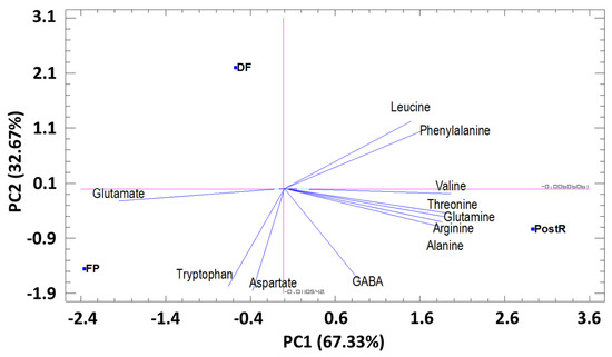To achieve a better understanding of the trends and relationships between the amino acids studied (11) in pomegranate leaves (in three phenological stages), principal component analysis (PCA) was applied. The first two principal components (PC) explained 100% of the total variation. The first component (PC1), which represents 65.85% of the total variance, was related to the amino acids, alanine, valine, arginine, threonine, phenylalanine, glutamine, and glutamate. PC2 represented 34.16% of the total variance. It was correlated with the content of GABA, leucine, tryptophan, and aspartate (Figure 4). The PCA results showed that the PC1 axis allows to discriminate the phenological stages FP and DF of PostR. PC2 allows discriminating the phenological stage DF from the phenological stages FP and PostR (Figure 4).
