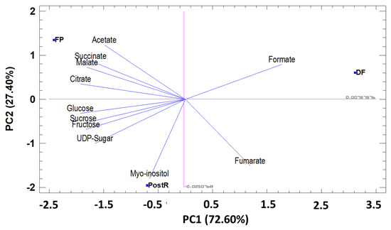 The PCA for the sugars and organic acids studied (11) in pomegranate leaves (in three phenological stages), showed that the first two principal components (PC) explained 100% of the total variation. The first component (PC1), which represents 72.60% of the total variance, was related to formate, malate, succinate, citrate, sucrose, fructose, glucose, and UDP-sugar. PC2 represented 27.40% of the total variance and was correlated with the content of acetate, fumarate and myo-inositol (Figure 5). The PCA results showed that the PC1 axis allows to discriminate the phenological stages FP, PostR and DF. PC2 Allows discriminating the phenological stage DF from the phenological stages FP and PostR (Figure 5).