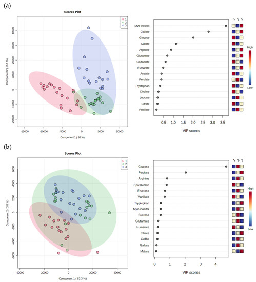 A PLS-DA regression was carried out to identify the correlations between the variables studied (substrates and phenological stages). PLS is a supervised method that uses multivariate regression techniques to extract, via linear combination of original variables (X), the information that can predict the class membership (Y). To assess the significance of class discrimination, a permutation test was performed. In each permutation, a PLS-DA model was built between the data (X) and the permuted class labels (Y) using the optimal number of components determined by cross validation for the model based on the original class assignment. In the PLS-DA model generated for the phenological stages the differences between the FP and PostR phenological stages are clearly observed, but both are related to the phenological phase of fruit development (Figure 6a). For the substrates, a differentiation between the PS0 and PS100 was observed, but the PS50 is shown to be broader with all substrates (Figure 6b). In addition, the study of the variable importance projection (VIP) calculated from the PLS-DA analysis confirmed the identification of the myo-inisitol, gallate, glucose and malate as a significant and differentiation between phenological stages, and the glucose, ferulate and arginine metabolites between the substrates used.