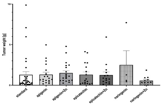 Regarding the study results, the significant inhibitory effect of naringenin on the development of DMBA-induced neoplastic processes in rats deserves special attention. Neoplastic tumors were found in only 2 out of 8 rats (incidence: 25%) and were considered to be grade 0–1 malignancy. The first palpable tumors in the group of animals receiving NGE were observed two weeks later (week 17) in comparison to both, the group receiving a standard diet and the group receiving API. Moreover, three weeks later than in the group of animals receiving API in combination with Zn and EC in combination with Zn. Similar study results were obtained by other authors [39,40,41,42,43,44,45,46,47]. NGE showed its positive effect on the neoplastic process in studies for: colon cancer [39], breast cancer [40], lung cancer [41], cervical cancer [42], bladder cancer [43], prostate cancer [44], gastric cancer [45], pancreatic cancer [46], and epidermoid carcinoma [47]. NGE is able to decrease cancer cell proliferation as well as induce cell cycle arrest and apoptosis in a variety of cancer cell lines. Thus, it has potential anticancer activity [48]. Moreover, NGE is involved in the mechanisms of inhibiting both inflammation and survival signaling pathways, such as NF-κB, MAPK, or AKT [35]. Moreover, it has been shown that NGE reduced adiposity and ameliorated adipose tissue inflammation with a moderate inhibitory effect on tumor growth in obese ovariectomized mice [49]. Another study showed that NGE reduces lung metastasis in a breast cancer resection model. It was administered orally and significantly decreased the number of metastatic tumor cells in the lung and extended the life span of tumor-resected mice. NGE inhibits the outgrowth of metastases after surgery via regulating host immunity. Thus, NGE can be an ideal surgical adjuvant therapy for breast cancer patients [50].