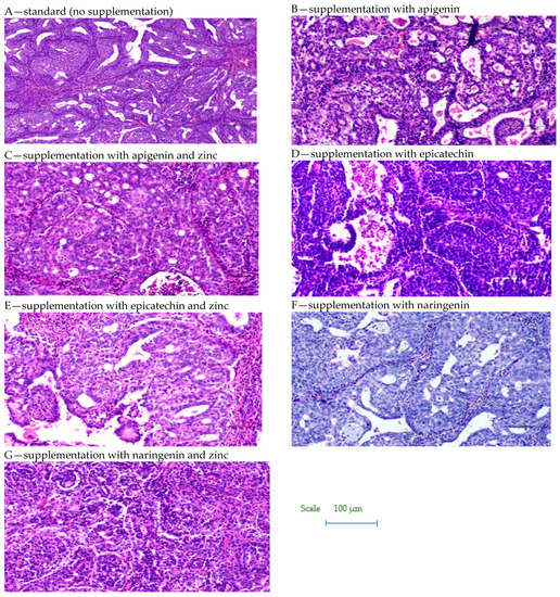 Based on the study, it was shown that supplementation of animals with selected dietary components influences the intensity of the tumor process in rats (Table 1, Figure 2 and Figure 3). It was shown that supplementing animals with NGE statistically significantly inhibited the development of the neoplastic process: the incidence was 25%, the number of tumors was 0–2, and they were characterized by a 0–1 degree of malignancy. In the case of animals supplemented with NGE in combination with Zn, the tumor incidence was 100%. Moreover, the first palpable tumors in this group were observed at week 17 (as in the case of NGE), the average weight of tumors was significantly lower (in the range of 0.01–1.85), and the number of tumors per rat was 1–2. Tumors obtained from animals supplemented with NGE and NGE in combination with Zn showed vesicular–vesicular structures, similar to a differentiated neoplasm with very low malignancy (adenocarinoma 0–1 grade of malignancy). In animals without supplementation, the incidence was 100%, and the first palpable tumors were found at week 15. The observed number of tumors per rat ranged from 2–8, and their weight ranged from 0.10–9.89 g. Tumors in the animals receiving a diet without supplementation were classified as adenocarcinoma (adencarcinoma I degree), the cells showed a tendency to proliferate, and massive proliferation was observed. In our previous research, it was found, that in the case of rats supplemented with zinc, the incidence was 100%, the number of tumors per rat ranged from 1–5, and those tumors were classified as I degree adencarcinoma [37,38].