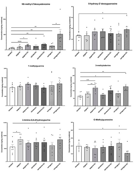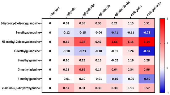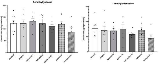 The ANOVA test analysis showed that there is a statistically significant influence of the supplementation on the content of N6-methyl-2’-deoxyadenine (p = 0.0001) and 3-methyladenine (p = 0.0006) in the urine of rats under neoplastic conditions. It was shown that animals supplemented with flavonoids in combination with Zn were characterized by a significantly higher content of N6-methyl-2’-deoxyadenosine and 3-methyladenine in urine, compared to animals on a standard diet without supplementation as well as those supplemented with flavonoids (apigenin, epicatechin, or naringenin separately) (Figure 4, Table 2). Figure 5 shows the observed average results for each group compared to group 1 (without supplementation).