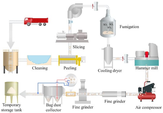 At present, there are mainly two ways of dry processing and wet processing in industry. The steps of dry processing include washing, peeling, slicing, fixing, drying, grinding and screening of konjac (Figure 2) [27]. In principle, according to the differences in composition, toughness, and hardness between idioblast and ordinary cells, ordinary cells are broken first by mechanical crushing, in which starch, cellulose, and other impurities are gradually crushed into konjac fly powder, while idioblast will not be broken under general crushing conditions, still maintaining the integrity of the particles. Through high-intensity repeated collision and friction, the impurities on the surface of the particles will continue to detach, and then be removed by sieving or wind separation, leaving translucent konjac flour particles. Usually, the KGM treated in this way has a slight smell, but when added to food or water, the smell can also be well masked. Therefore, most people can accept it.